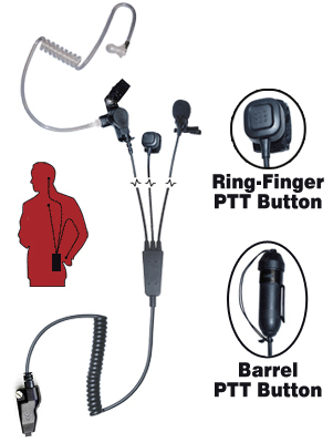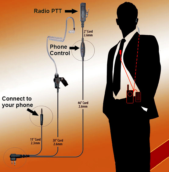 This new security kit includes all the fine features of our workhorse The "Two Wire Palm microphone" and includes a 3rd cable for simultaneous cellular phone attachment. The MP3 Two Wire Palm mic includes the standard side bar PTT and also has a separate in line send/end button for your media device.